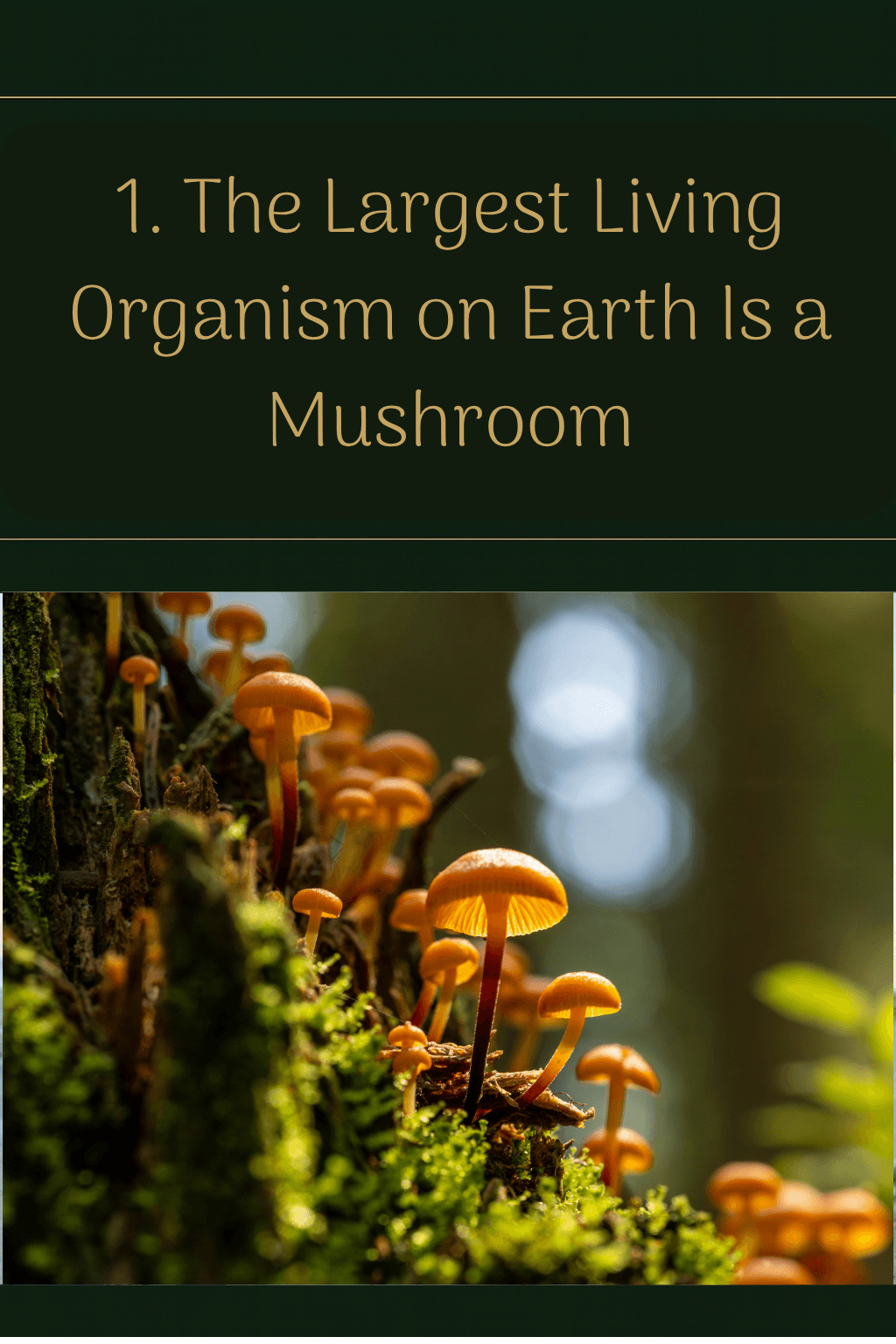 The world’s largest known organism is a fungus in Oregon’s Blue Mountains that occupies 2,384 acres of soil—roughly 1,665 football fields, or nearly four square miles of turf.